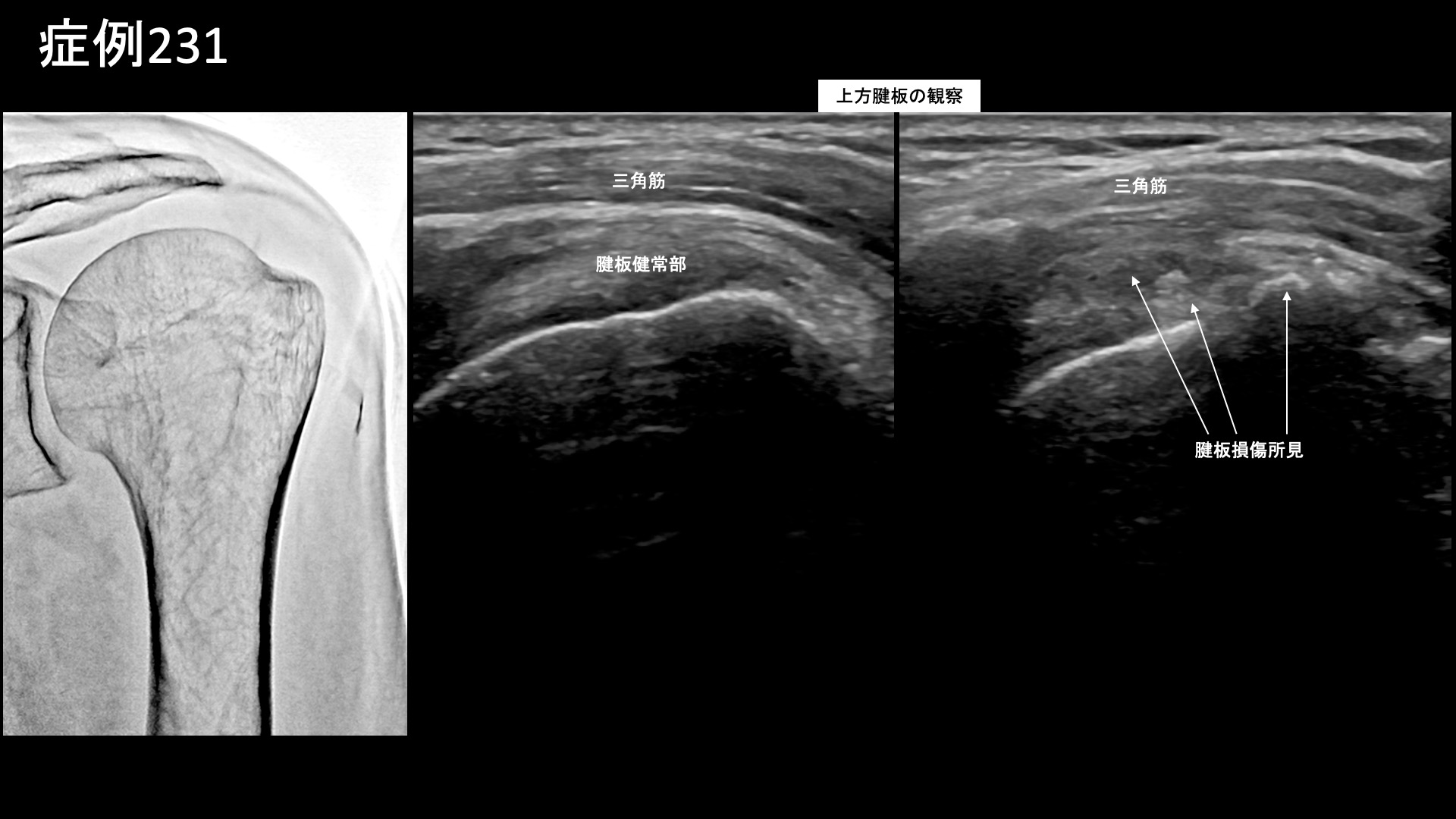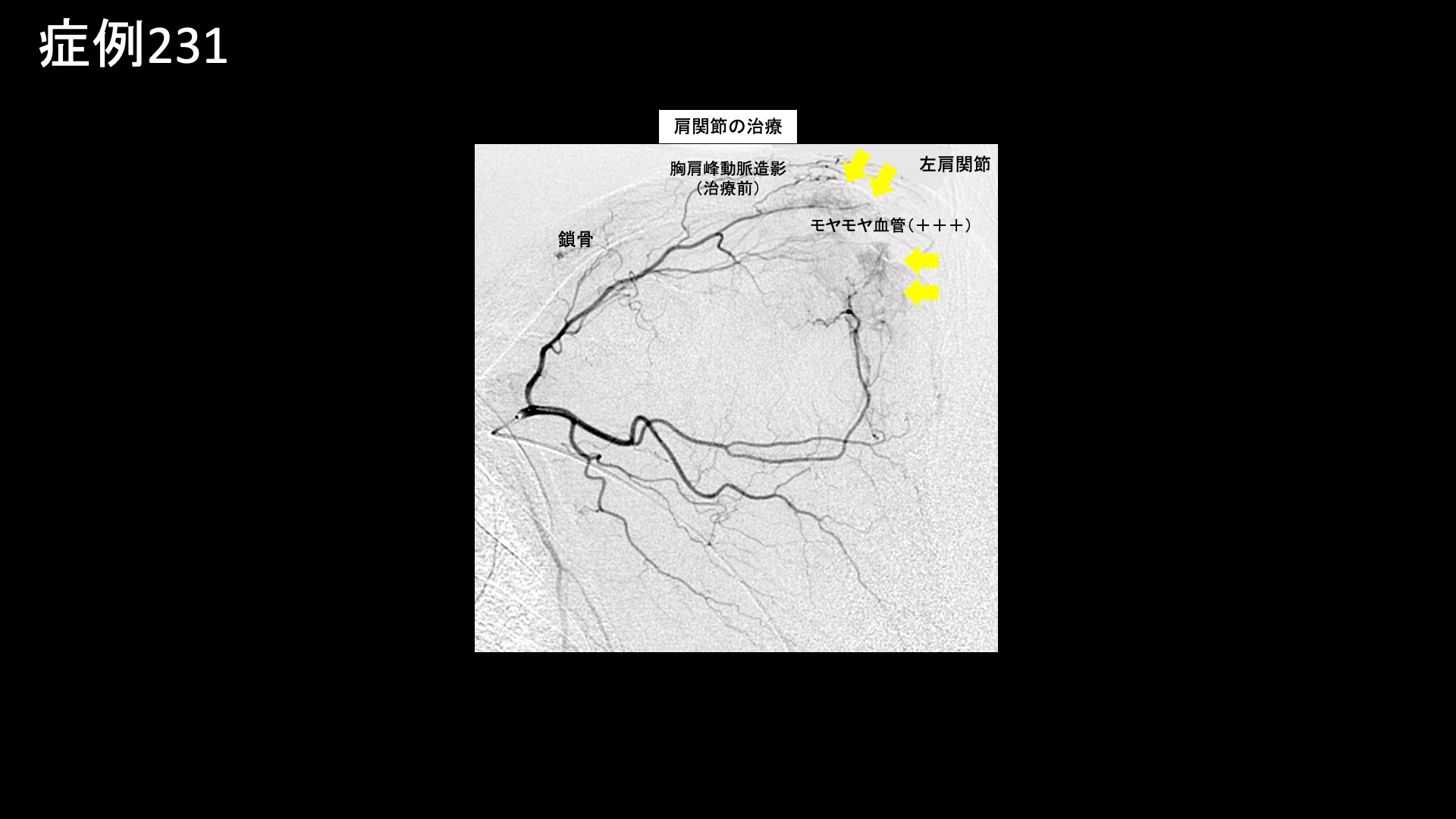 肩:肩こり・四十肩・五十肩 【50代:男性】肩腱板断裂手術後の遺残痛、及び再断裂による痛みに対するモヤモヤ血管治療(腱板断裂、手術後遺症、再断裂、肩関節周囲炎) 2025.08.26 鴨井院長による動画解説 受診までの経過 荷物運搬などの重労働により1年半前から左肩が痛むようになり、MRI検査で腱板断裂と診断されました。腕が全く上がらなくなってしまい、10ヶ月前に手術を受けました。入院は1ヶ月に及びましたが、腕が挙がるようになりました。しかし、痛みがとれず、じっとしていればよいものの、動かすと痛みが生じていました。MRI検査では、手術で縫合した部分の一部に再断裂を指摘されていました。リハビリを続けていましたが、リハビリで痛みを良くすることはできないと言われ、当院を受診されました。 診察時の所見 肩関節の可動域をチェックすると、外転、屈曲で軽度の制限がありましたが、日常生活には支障をきたさないくらいに保たれていました。レントゲンでは特に異常はありませんでした。エコー検査をすると、肩関節の前方において、腱板疎部や上腕二頭筋長頭腱周囲にモヤモヤ血管を反映した異常血流信号を認めたほか、上方腱板に断裂所見を認めました。腱板断裂後、手術により可動域は改善したものの、一定の痛みが残存し、さらに再断裂に伴う炎症も相加されている状態でした。治療適応と判断し、モヤモヤ血管(病的新生血管)に対する運動器カテーテル治療(微細動脈塞栓術)を受けていただきました。 治療の所見 血管造影を行うと、胸肩峰動脈でモヤモヤ血管が濃染像として描出されました。治療後は画像上速やかに消失しました。その他複数個所の治療を行い終了しました。 治療後の経過 治療後1週間で、左上腕の痛みが消失しました。肩関節前方の痛みはまだ残っていましたが、それも1ヶ月経過するうちに無くなりました。治療後2ヶ月、元々の痛みは取れた感じがする一方で、痛くなかった部位が少し痛み、特に腕を前方に伸ばしたときに痛みがありました。術前に比べればかなり楽になっており、日常生活での支障はないとのことでした。治療後3ヶ月、痛みはほぼ消失しました。前述の痛みがまだ多少残っているものの、自然軽快が見込まれたため、終診としました。腱板断裂による痛みについては、8-9割の痛みが取れて日常生活に支障をきたさなくなった後も、完全に消失するには半年~1年かかることもあります。その内に気にならなくなり、いつの間にか治っているという感覚になる方もおられます。 本症例では、肩関節への過負荷が原因でした。手術後の再断裂リスクは新規の断裂よりも高いのですが、お仕事柄、今後も過負荷による再断裂が懸念されます。無理を重ねないよう、慎重にお過ごしいただきたいと思います。 腱板疾患の詳しい病状説明はこちら 【60代:男性】ゴルフのフルスイングで生じる腰痛。仙腸関節障害に対するカテーテル治療(仙腸関節障害、筋・筋膜性疼痛症候群) 前の記事 【50代:男性】新型コロナウイルスワクチン接種後、鬼の手に⁉ 誰にも理解してもらえず3年間苦しんだ両肩~両手指の痛み(新型コロナウイルスワクチン接種後遺症、副反応、SIRVA、肩関節周囲炎、手指変形性関節症) 次の記事