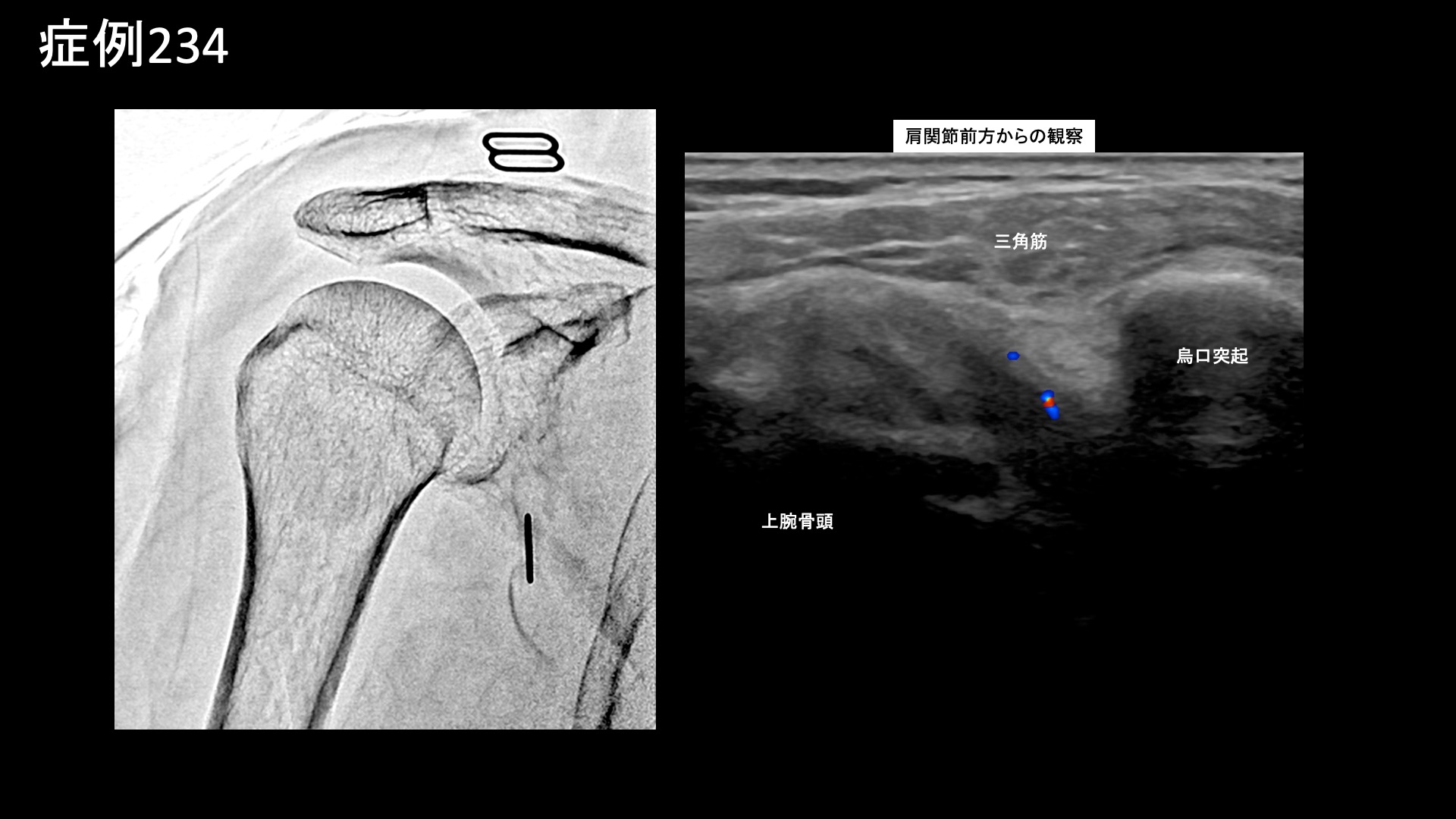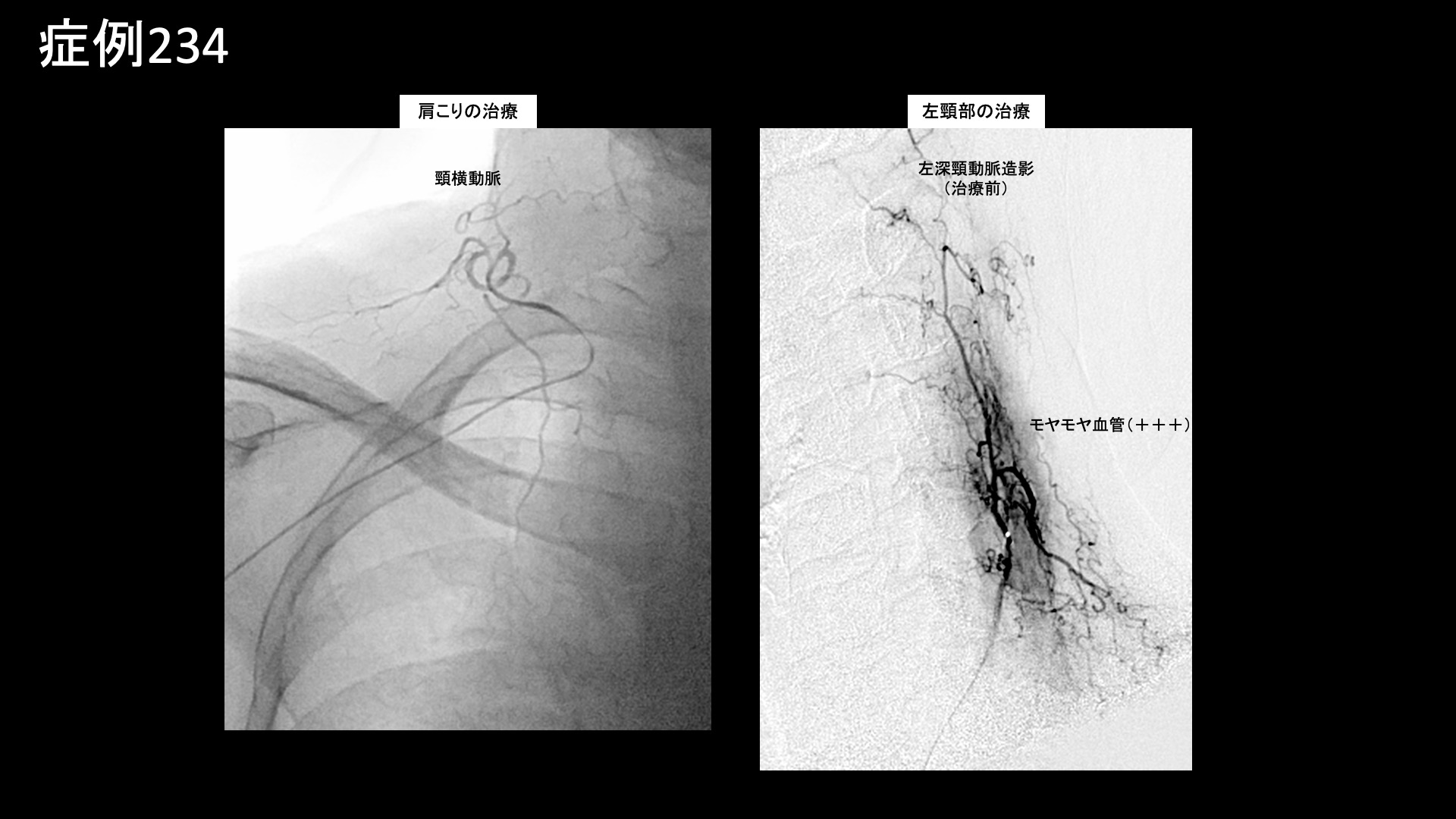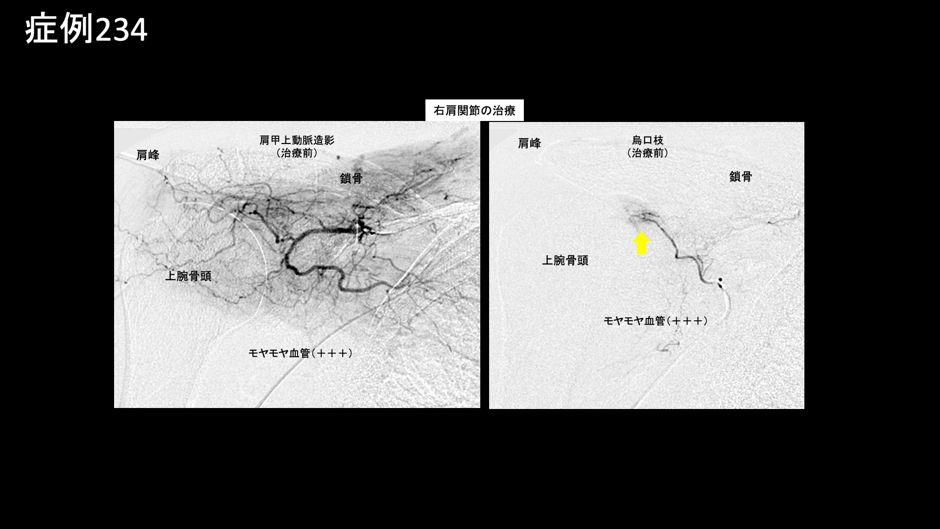 肩:肩こり・四十肩・五十肩 【50代:女性】五十肩も首肩こりも一網打尽、血管から痛みを治すカテーテル治療(五十肩、凍結肩、肩関節周囲炎、首肩こり) 2025.09.05 鴨井院長による動画解説 受診までの経過 重いものをもったことがきっかけで3ヶ月前から右肩が痛むようになりました。病院では五十肩と診断されました。ズキズキと常に痛みがあり、夜も寝られないほどでした。仰向けで寝ることはできませんでした。長年、頭痛や首肩こり(特に左側)がありましたが、それも悪化しているように感じました。 診察時の所見 右肩関節の可動域は、外転90度(真横から腕を挙げる動作で水平までが限界)、外旋45度、反対の肩に手を回すことはできず、後ろに手を回しても臀部に触れることしかできないなど、大きく制限されていました。レントゲンでは異常ありませんでしたが、エコー検査では肩関節前方からの観察において炎症に伴うモヤモヤ血管を反映した異常血流信号を認めました。腱板などの組織損傷はありませんでした。治療適応と判断し、モヤモヤ血管(病的新生血管)に対する運動器カテーテル治療(微細動脈塞栓術)を受けていただきました。 治療の所見 肩関節において血管造影を行うと、肩甲上動脈や烏口枝にてモヤモヤ血管が濃染像として描出されました。首肩こりの治療では、症状の強さに合致して、特に左深頸動脈で同様にモヤモヤ血管が描出されました。それぞれ、治療後は画像上速やかに消失しました。その他複数箇所の治療を行い終了しました。 治療後の経過 治療後2週間くらいで夜間痛がとれてきました。寝られるようにもなり、治療後1ヶ月くらいになると7割方の症状は改善し(3/10程度)、肩こりも感じなくなりました。頭痛はまだ多少ありました。痛みがとれてきたので、後は可動域だけだなと思えるようになりました。治療後2ヶ月、9割方の症状が改善し(1/10程度)、腕も上がるようになりました。外転145度まで回復していました。この間、特別なリハビリを行ったわけではありません(ほとんどの場合で不要です)。ご遠方であり、その後の受診は途絶えていますが、ここまでくればぶり返す心配はなく、残りの症状もじきに完全に消失します。五十肩はカテーテル治療によりまず間違いなく改善すると言える疾患です。頭痛や首肩こりを合併している場合は、一緒に治療可能ですので、併せてご相談いただければと思います。 五十肩の詳しい病状説明はこちら 【60代:男性】切らずに治すヘルニア治療!1ヶ月前から増悪した10年来の腰痛に対するモヤモヤ血管治療(腰椎椎間板ヘルニア、筋・筋膜性疼痛症候群) 前の記事 【60代:男性】マラソンランナーを悩ませた繰り返す肉離れによるふくらはぎの痛み(腓腹筋痛症)に対するモヤモヤ血管治療 (腓腹筋痛症、肉離れ後遺症) 次の記事