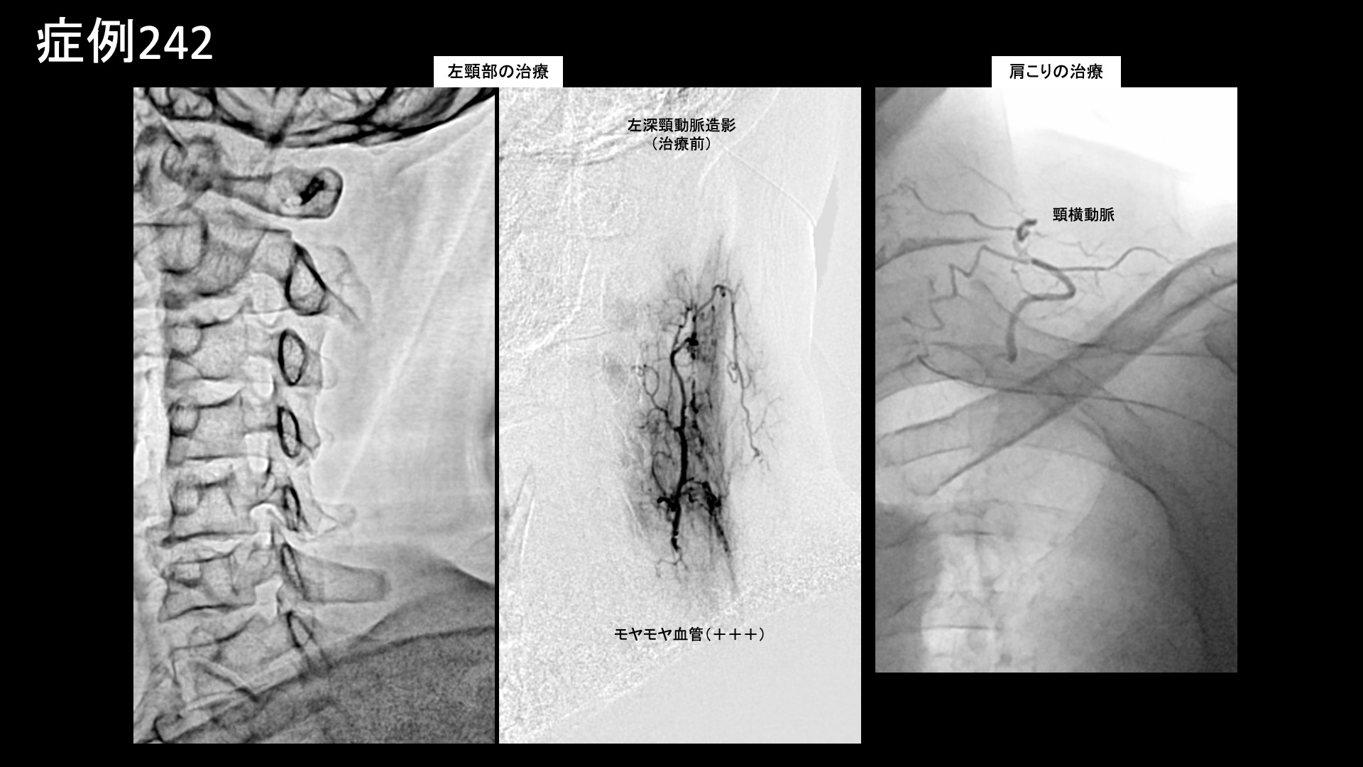 肩:肩こり・四十肩・五十肩 【50代:男性】真っすぐに座ると首から腕に激痛が・・車の運転がつらい・・重症首肩こりに対するモヤモヤ血管治療(首肩こり、頸椎症性神経根症) 2025.10.09 鴨井院長による動画解説 受診までの経過 3年前から首に違和感がありました。4ヶ月前に左肩に強烈な痛みが走り、レントゲン検査・MRI検査を受けたところ、症状の無い右肩も含めて両肩腱板に石灰沈着を認め、石灰沈着性腱板炎およびストレートネックと言われました。リハビリの方針となりましたが、効果を感じられず通院を止めていました。その後、1ヶ月前頃からは異なる症状が出てきて、背骨が真っ直ぐになるような姿勢をとると首~左肩~左腕にかけて痛むようになりました。特に椅子に座ると顕著であり、車の運転が日常的に苦痛となりました。治療方法を求めて当院を受診されました。 診察時の所見 症状の性状からは、肩関節周囲炎ではなく、頸椎症性神経根症や、重症の首肩こりである頸肩腕症候群などが疑われました。やはり、両肩関節の可動域は問題ありませんでした。一定の動作時時は見られました。首の可動域は中等度制限されており、特に後屈ではより顕著でした。レントゲンでは、頸椎は比較的保たれていました。肩関節では右側で腱板領域に粗大石灰を、左側でも少量の石灰沈着が見られました。しかしながら、エコー検査ではこれらの石灰沈着部周囲には炎症所見は見られず、陳旧性のものであることが示唆されました。一方、上腕二頭筋長頭腱周囲には水腫が見られるなど一定の炎症所見が認められました。また、棘上筋腱の部分断裂も認められました。以上より、首肩こり、および軽度の両側肩関節周囲炎(有痛性腱板損傷および、石灰沈着性腱板炎後遺症)と診断しました。治療適応と判断し、モヤモヤ血管(病的新生血管)に対する運動器カテーテル治療(微細動脈塞栓術)を受けていただきました。 治療の所見 血管造影を行うと、やはり肩関節のモヤモヤ血管よりも頸部のモヤモヤ血管の方が目立っていました。特に左頸部における深頸動脈造影においてモヤモヤ血管が濃染像として描出されました。治療後は画像上速やかに消失しました。その他複数箇所の治療を行い終了しました。 治療後の経過 治療当日から改善し、治療後2週間では、ほとんど痛みが気にならなくなりました。首を動かした際に時折つんとするような痛みが出る程度でした。よく眠れるようにもなりました。『正直半信半疑だったが、良くなってうれしい』と言われました。その後、痛みではないものの首から肩にかけてずーんと感じることはありましたが、治療後2ヶ月半になると痛み・こりともほぼ消失しました。運動習慣も取り入れていただき、様子を見ることとしました。その後も左頸部~肩の症状はぶり返すことなく順調に経過されています。尚、腱板石灰についてはやはり陳旧性のものであり、症状改善後も残存していました。新鮮なものではないため、自然吸収は期待できませんが、残存していても痛みなく過ごせる方は多いです。本症例は、頸部由来の上肢に至る神経症状をきたしている状態でした。頸椎症性脊髄症については治療効果に限界がありますが、神経根症までの段階、あるいは筋・筋膜・血行などに起因するいわゆる重症の首肩こりであれば、モヤモヤ血管に対する運動器カテーテル治療が非常に有効です。治療後は、痛みの改善だけでなく、よく眠れるようになった、眠りが深くなった、身体が軽くなったなどの感想をいただくことが多いです。首肩の不調は全身の不調につながりますので、お悩みの方はぜひご検討いただくとよいと思います。 首こりの詳細はこちら 【80代:男性】火が出るような痛みに襲われ夜も寝られず・・発症1ヶ月の頭部/顔面に生じた帯状疱疹後神経痛(帯状疱疹後神経痛) 前の記事