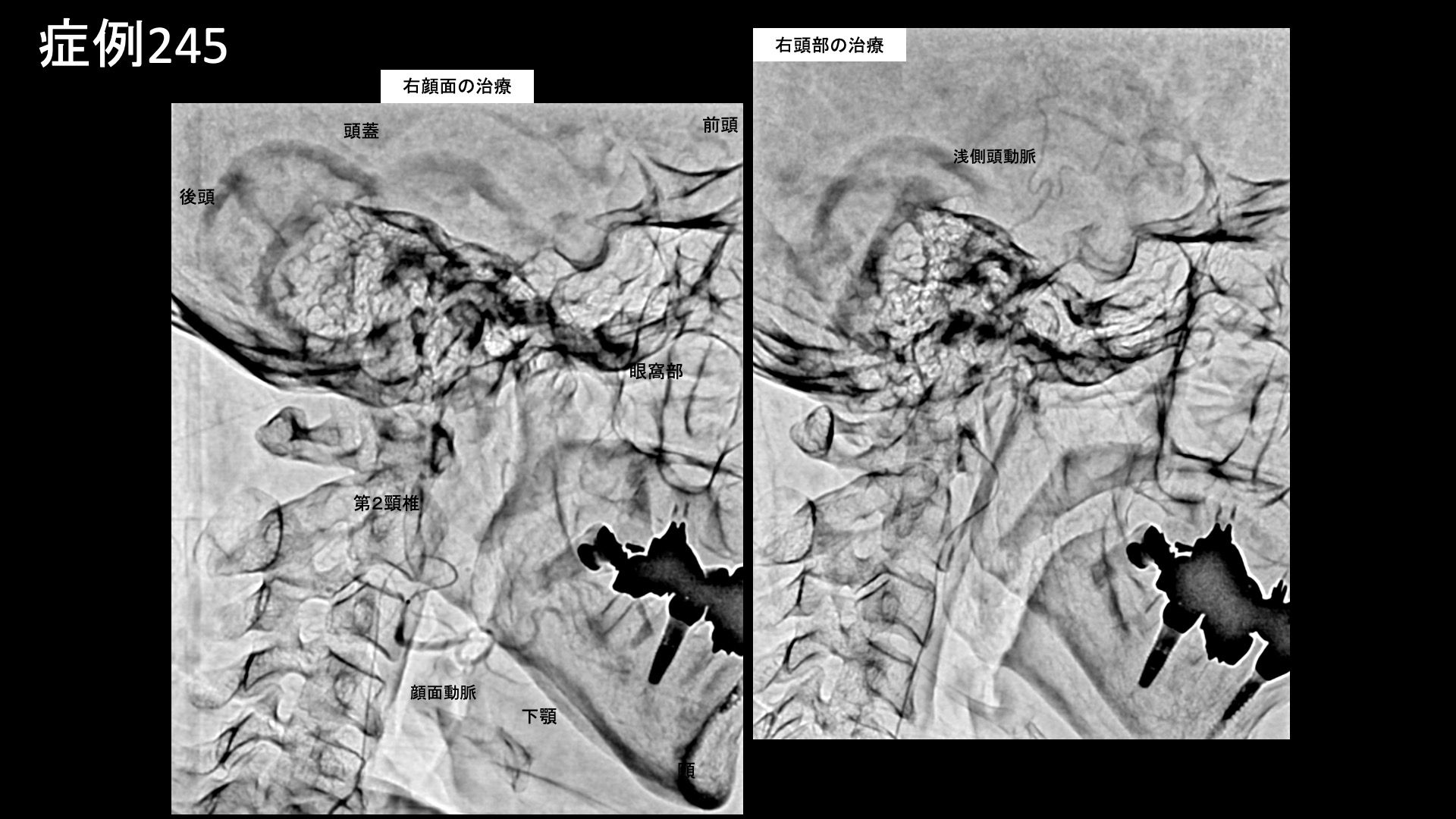 頸部の治療では、深頸動脈造影でモヤモヤ血管が濃染像として描出されました。首肩こり部位の治療を行った後、頭部・顔面では、浅側頭動脈、顎動脈、顔面動脈の各血管より治療を行いました。それぞれ再現痛を認めました。