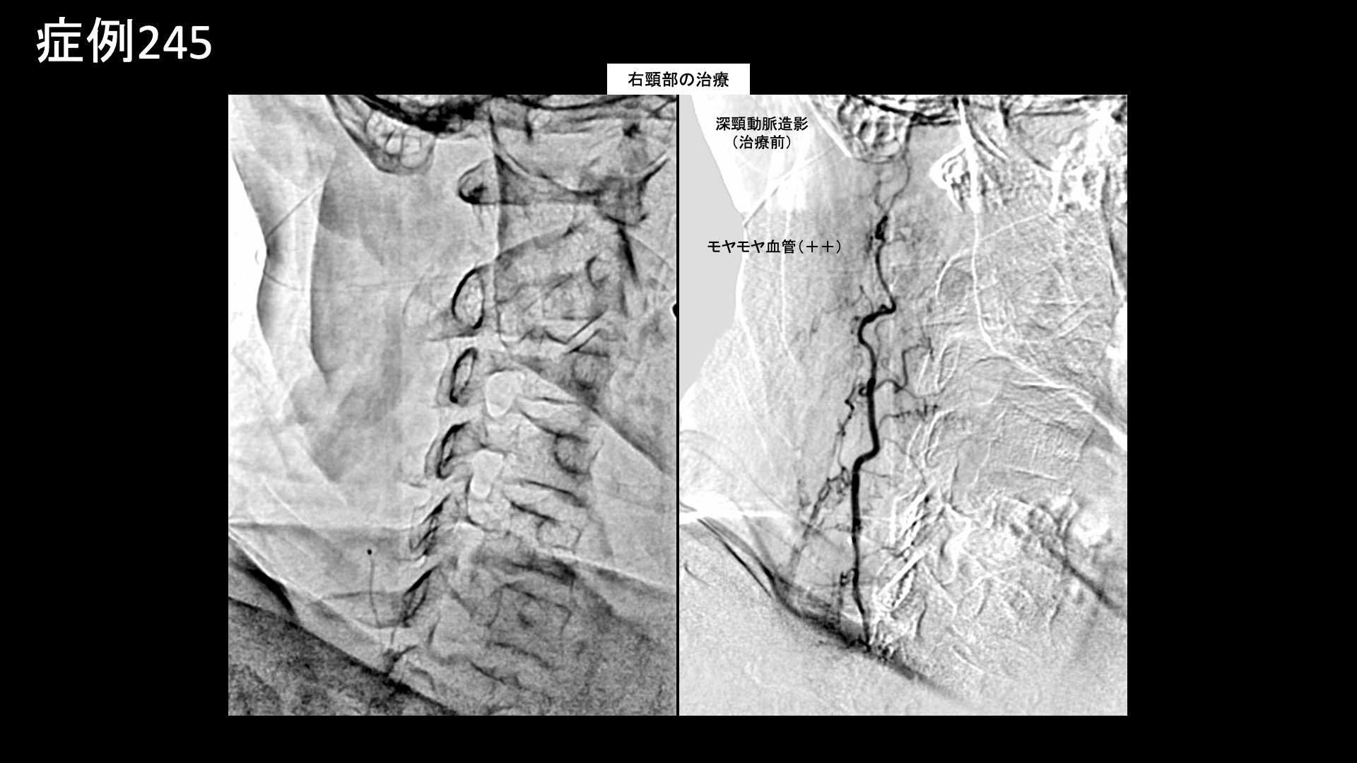 頭部顔面という罹患部位、発症10ヶ月であること、うつ病があることなど治療抵抗要因が複数ありました。無効の可能性があることをご理解いただいたうえで、モヤモヤ血管(病的新生血管)に対する運動器カテーテル治療(微細動脈塞栓術)を受けていただきました。首肩こりの治療も希望されたため、併せて治療を行いました。動脈硬化が高度であり、治療にはやや難渋しましたが、時間をかけて慎重に丁寧に治療を行い、特に問題なく無事に治療を終えました。