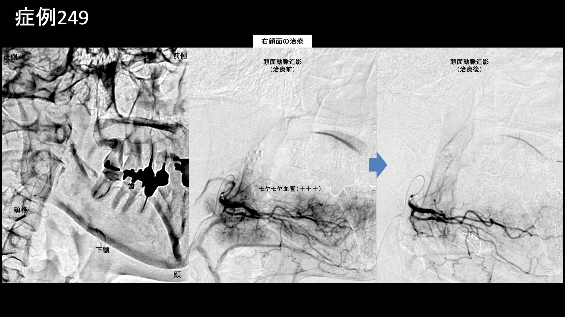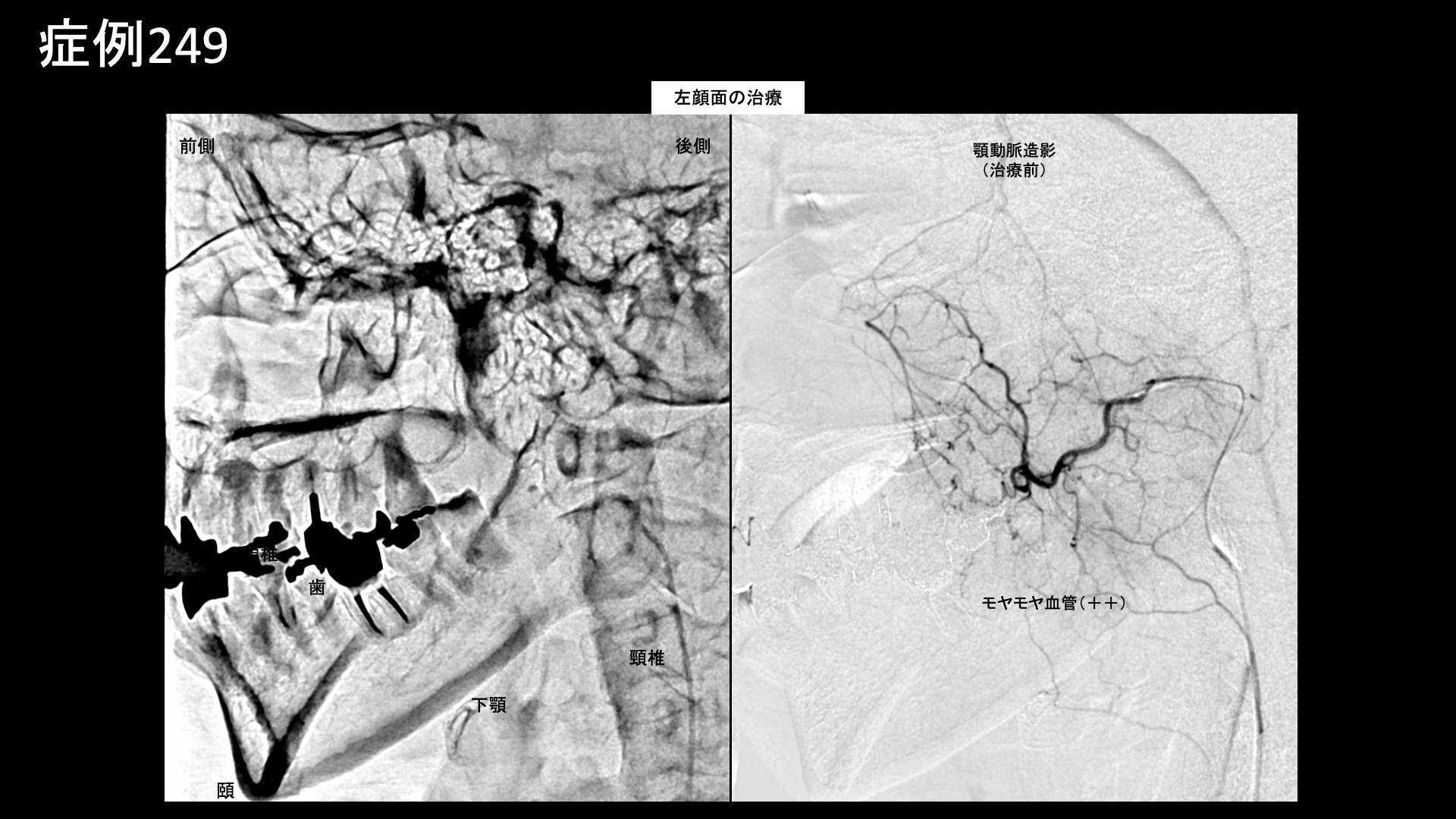 血管造影を行うと、顎動脈、顔面動脈でモヤモヤ血管が濃染像として描出されました。いずれも、頬に一部が灌流する血管です。治療中は、同部に一致して、再現痛および、色調変化が見られました。薬液を投与すると、一時的に皮膚の色調が白くなりその後赤みが戻り、元の色調に回復するという変化が起きます。これらを確認することで、治療標的部位に十分な治療ができたかどうかを確かめます。治療後モヤモヤ血管は画像上速やかに消失しました。その他複数箇所の治療を行い終了しました。