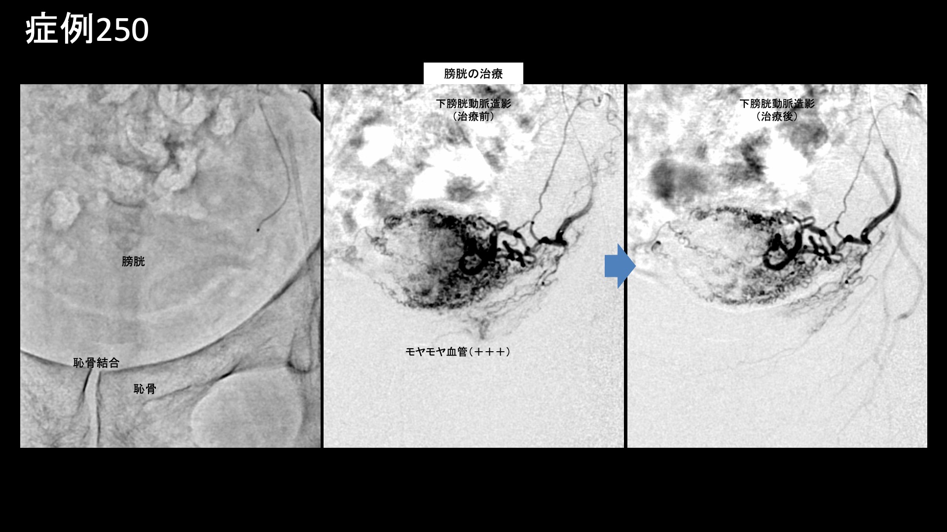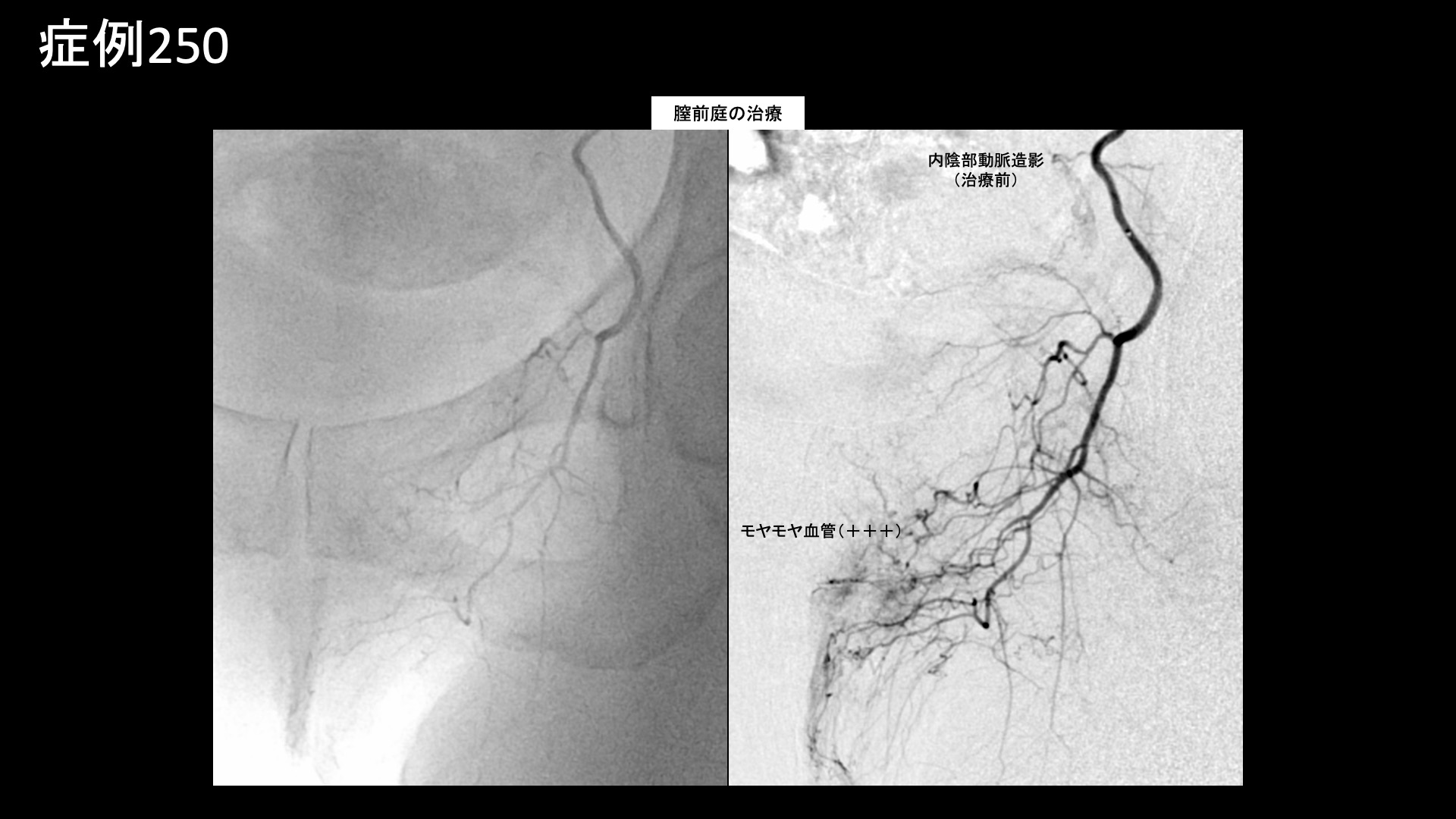 股:変形性股関節症など 【60代:女性】尿が溜まると膣が痛い!夜も寝られず。繰り返す膀胱炎から発症した間質性膀胱炎および膣前庭炎に対するモヤモヤ血管カテーテル治療(間質性膀胱炎、膣前庭炎) 2025.11.21 鴨井院長による動画解説 受診までの経過 1年前から膀胱炎を繰り返していました。最初は下腹部に痛みがありましたが、その後膣周囲など全体的に痛みが広がりました。1-2時間立っていると痛みが出てきますが、座るときにも痛みが出ます。膣の周りに針で刺されたような痛みがあり、夜間も痛みで目が覚めてしまうほどでした。ひどい時は5-6回目が覚めることもありました。トイレに行くと少し痛みが和らぎました。泌尿器科や婦人科を受診し、膀胱鏡検査を何度か受けたほか、造影MRI検査なども受けましたが特に異常所見はありませんでした。尿が溜まると膣の痛みが生じることから、間質性膀胱炎と診断されました。一方、痛みの主体は膣の入り口部分であり膣前庭炎ではないかとも思い、併せて治療目的で当院を受診されました。 診察時の所見 間質性膀胱炎に膣前庭炎が合併することは少なくありません。繰り返す膀胱炎をきっかけに広い範囲で炎症をきたした状態と考えられました。この場合、それぞれの治療を行う必要があります。治療適応と判断し、モヤモヤ血管(病的新生血管)に対する運動器カテーテル治療(微細動脈塞栓術)を受けていただきました。 治療の所見 血管造影を行うと、下膀胱動脈においてモヤモヤ血管が濃染像として豊富に描出されました。非常に強い炎症の存在が示唆されました。治療時の再現痛も強く認められました。治療後モヤモヤ血管は画像上速やかに消失しました。また、内陰部動脈では一部膣前庭に灌流する分枝があり、同部位にモヤモヤ血管が濃染像として描出されました。同様に、治療時に一定の再現痛を認めました。その他複数箇所の治療を行い終了しました。 *再現痛とは、薬液投与時に普段の痛みが一定程度再現される現象です。責任血管の同定のための参考とします。 治療前画像:損傷を受ける、あるいは繰り返しのストレスにより発生した異常な新生血管 治療後画像:カテーテルを用いて塞栓物質を血管内に投与し新生血管を塞いだ状態 治療費用:治療する部位によって費用が異なりますのでこちらをご参照ください。 主なリスク・副作用等:針を刺した場所が出血により腫れや痛みを生じたり、感染したりすることがあります(穿刺部合併症)。造影剤によるアレルギー(皮膚のかゆみ・赤み・息苦しくなるなどの症状)が出ることがあります。 治療後の経過 治療後3週間、ひどい痛みが減りました。特に日中が楽になりました。夜間に痛むものの、トイレの頻度は3-4回に減りました。術前同様、排尿後は楽でした。治療後1ヶ月になるとさらに改善が進み、全体としては6割~7割方の症状が改善しました(3-4/10程度)。夜間痛があまり生じなくなり、寝られるようになりました。その後、痛むときがありぶり返すのではないかと心配になりましたが、また改善が進み、治療後3ヶ月時点では元の症状の8割~9割方が改善しました(1-2/10程度)。まだ強く痛むことがあるにはありましたが、それでも元の痛みの半分程度でした。不安もだいぶ軽減されていました。まだ完治には至っておらず、元の炎症所見の程度を考慮すると、追加治療による改善の余地があるものと思われました。今後、ご希望があれば追加治療を検討する予定です。膣前庭炎合併の間質性膀胱炎という非常に難しい痛みを抱えておられましたが、まずはここまで改善されて何よりでした。繰り返す膀胱炎は、間質性膀胱炎や膣前庭炎を発症する要因の一つですので要注意です。 間質性膀胱炎の詳細 【60代:男性】痛くてドアノブも回せない、5年以上続いた手首の痛み。腱鞘炎に変形性手関節症を合併した一例(尺側手根伸筋腱の腱鞘炎、変形性手関節症、ドゥケルバン腱鞘炎) 前の記事 【50代:男性】最初からここに来ればよかった・・ステロイド注射無効で半年間苦しんだ石灰沈着性腱板炎による肩の痛み(石灰沈着性腱板炎、肩関節周囲炎) 次の記事