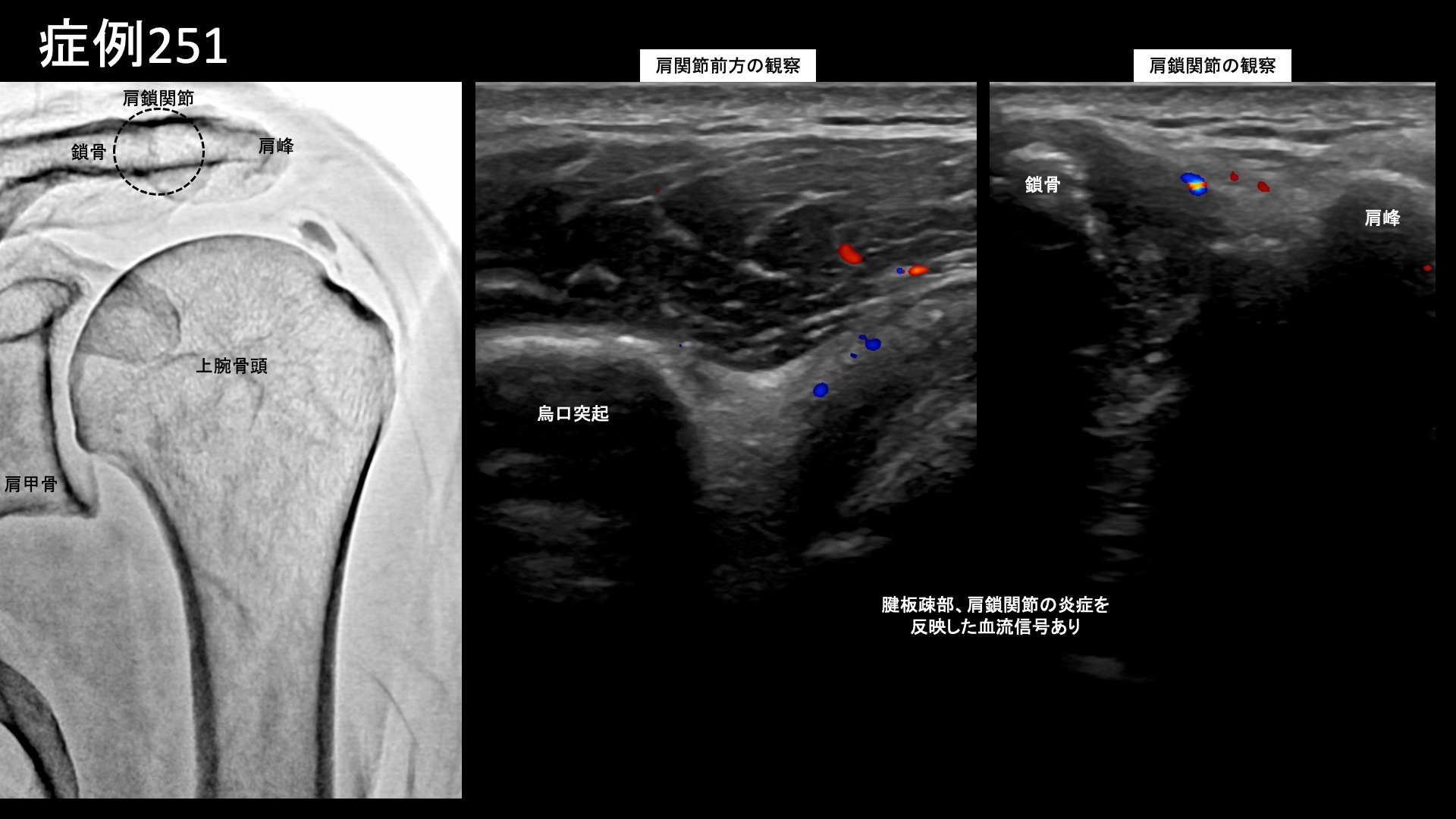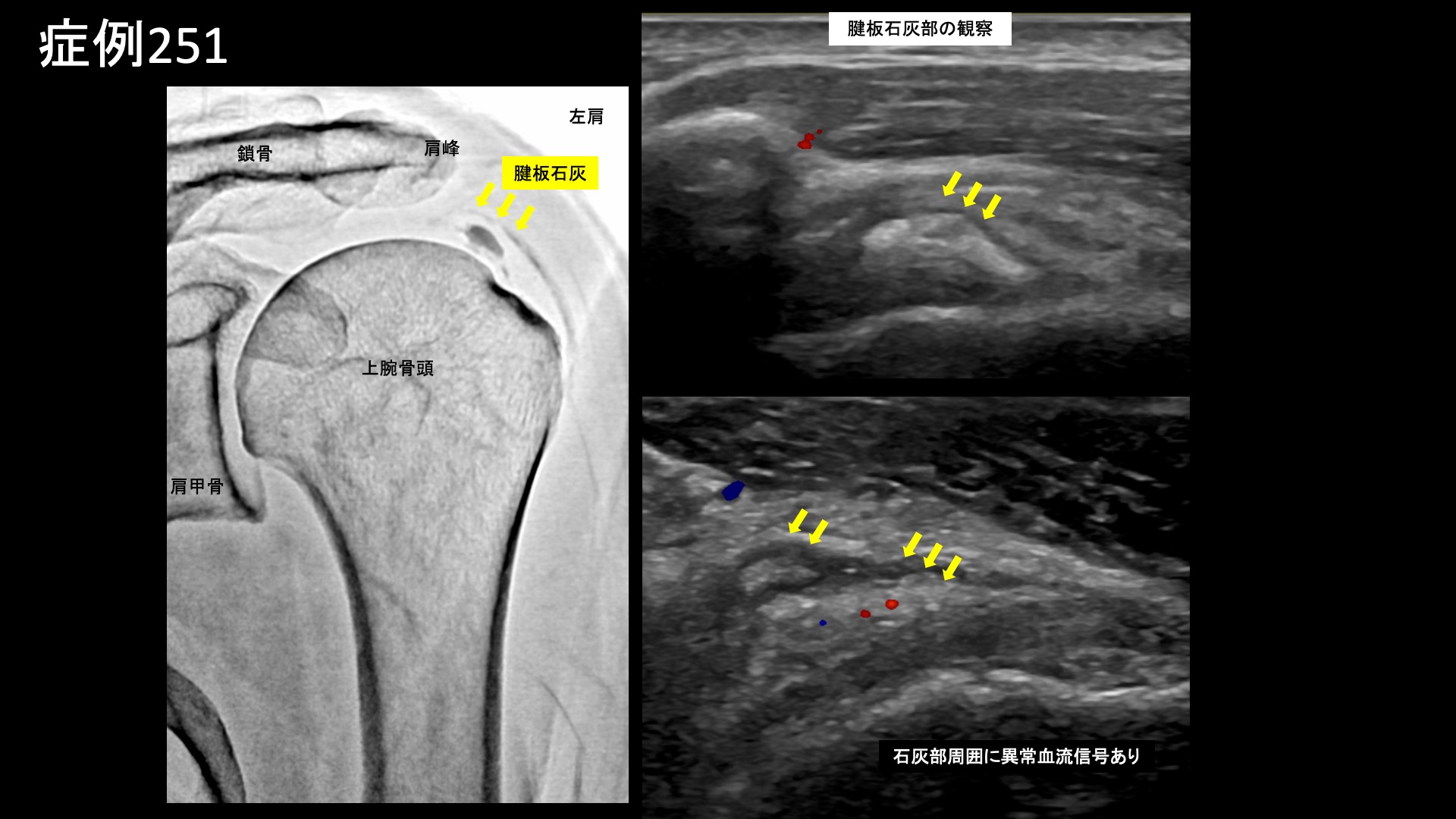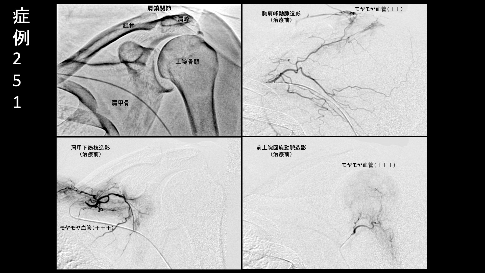 肩:肩こり・四十肩・五十肩 【50代:男性】最初からここに来ればよかった・・ステロイド注射無効で半年間苦しんだ石灰沈着性腱板炎による肩の痛み(石灰沈着性腱板炎、肩関節周囲炎) 2025.11.26 鴨井院長による動画解説 受診までの経過 半年前から左肩が痛むようになり、整骨院や整形外科に通っていました。鎮痛薬内服のほか、ステロイド注射も複数回受けましたが、効果は感じられず、酷くなるばかりでした。腕が挙げられなくなり、ついには夜間痛まで生じるようになりました。当院の治療を知り受診されました。 診察時の所見 腕は水平までも挙がらない状態でした(外転80度)。レントゲンでは腱板領域に石灰を認め、エコー検査では同部位に一致した腱板石灰沈着を認めたほか、周囲に炎症による(モヤモヤ血管を反映した)異常血流信号を認めました。更に、腱板疎部領域や肩鎖関節においても同様に炎症所見を認めました。石灰沈着性腱板炎による肩関節周囲炎の診断です。治療適応と判断し、モヤモヤ血管(病的新生血管)に対する運動器カテーテル治療(微細動脈塞栓術)を受けていただきました。 治療の所見 血管造影を行うと、胸肩峰動脈、前上腕回旋動脈、肩甲下筋枝などでモヤモヤ血管が濃染像として描出されました。特に肩甲上動脈では強い濃染像を認めました。血管造影所見を比べると、石灰沈着性腱板炎では、このように五十肩(凍結肩)よりも強い炎症であることが多いです。ステロイド注射が効かなかったというのも頷けます。いずれも治療後モヤモヤ血管は画像上速やかに消失しました。その他複数箇所の治療を行い終了しました。 治療前画像:損傷を受ける、あるいは繰り返しのストレスにより発生した異常な新生血管 治療後画像:カテーテルを用いて塞栓物質を血管内に投与し新生血管を塞いだ状態 治療費用:治療する部位によって費用が異なりますのでこちらをご参照ください。 主なリスク・副作用等:針を刺した場所が出血により腫れや痛みを生じたり、感染したりすることがあります(穿刺部合併症)。造影剤によるアレルギー(皮膚のかゆみ・赤み・息苦しくなるなどの症状)が出ることがあります。 治療後の経過 治療翌日から改善しました。治療後3週間では、ほとんどの痛みが無くなりました。肩関節の可動域も完全に回復し、バンザイもできるようになりました。半年間苦しんでいた痛みのあまりの回復ぶりに、『最初からここに来ればよかった』と話されるほどでした。エコーで確認すると、まだ石灰沈着については大きな変化はありませんでしたが、今後吸収されていくことも期待できます。非常に経過良好であったことから、終診となりました。石灰沈着性腱板炎は強い炎症を伴っていることが多く、その苦痛も五十肩以上になることが少なくありません。カテーテル治療は強い炎症にこそ、強い効果を発揮します。実際に、本症例では非常に早期から快復しました。罹病期間が長くなければ、石灰も吸収されて無くなります。 非常に良い適応疾患の一つですので、お悩みの方はぜひご検討いただくと良いと思います。 石灰沈着性腱板炎の詳細 【60代:女性】尿が溜まると膣が痛い!夜も寝られず。繰り返す膀胱炎から発症した間質性膀胱炎および膣前庭炎に対するモヤモヤ血管カテーテル治療(間質性膀胱炎、膣前庭炎) 前の記事 【70代:男性】急激に悪化した膝の痛みで歩けなくなり夜も寝られず水も溜まる・・ネフローゼ症候群を合併した変形性膝関節症の実例(変形性膝関節症、ネフローゼ症候群) 次の記事