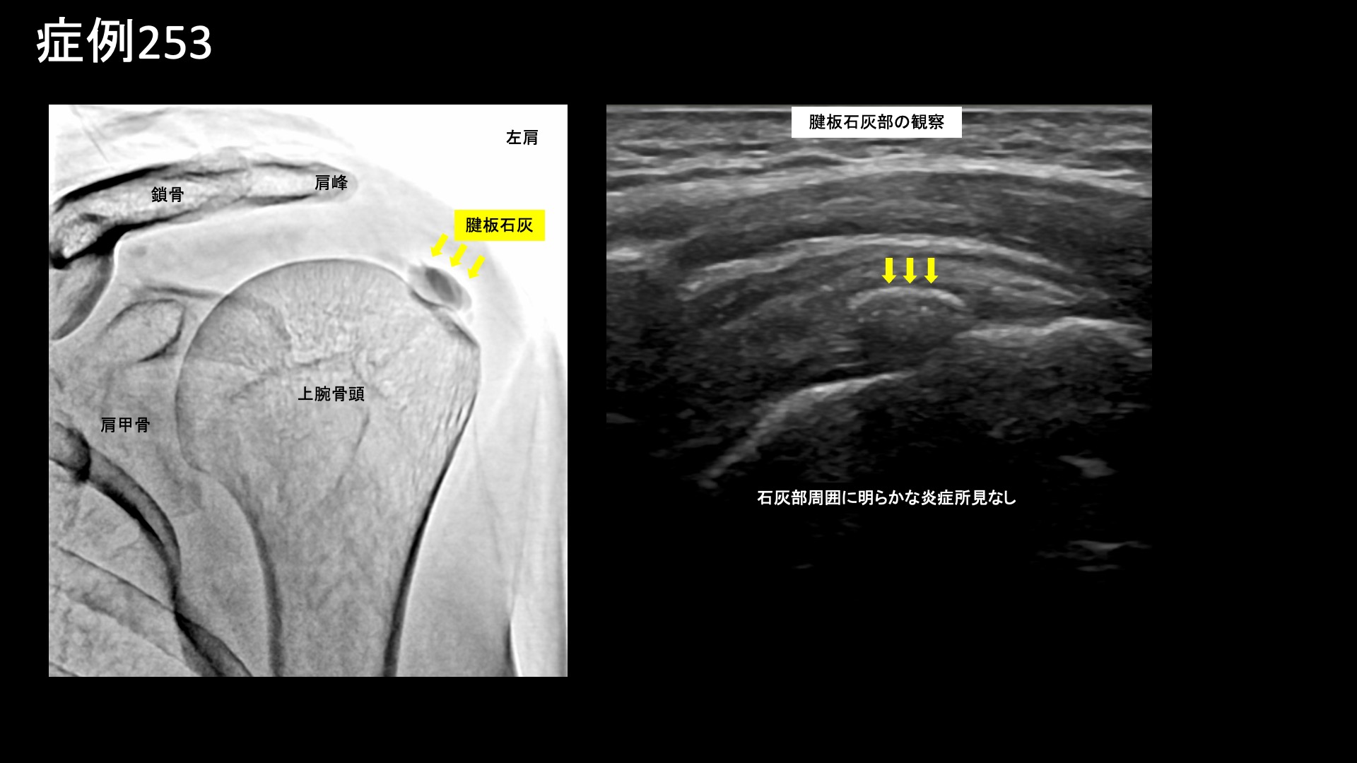 治療後3日で夜間痛が緩和されました。治療後2週間、慢性的な痛みや違和感も軽減されてきました。治療後2ヶ月、夜間の痛みは完全に消失していて、日中もほとんどの痛みが消失(1/10程度)、動作終末時にあった痛みも消失しました。腕を回すときに多少の痛みを感じるものの日常生活ではほとんど気にならないものでした。経過良好であり、終診としました。石灰については3年経過しているものであり、レントゲンやエコーでも陳旧性で長期経過後の様相をしていることから、自然吸収は期待できません。今後も残存するものと思われますが、この石灰そのものが痛みを出すわけではありませんので、残っていても痛みなく過ごすことはできます。ワクチン接種後の時系列についてご本人の記憶が定かでないため、ワクチン接種との因果関係は不明ですが、ワクチン接種後の肩の痛みであるSIRVAの一病態として、石灰沈着性腱板炎を発症した事例も報告されています。本症例もそれに該当していたのかもしれません。