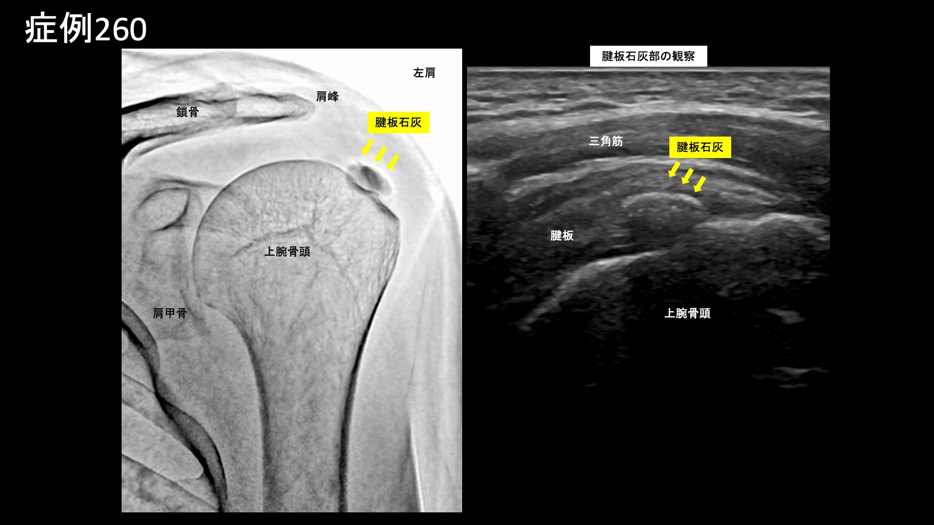 肩:肩こり・四十肩・五十肩 【40代:男性】3回目の新型コロナウイルスワクチン接種後に3年間悩まされた石灰沈着性腱板炎による肩の痛み(石灰沈着性腱板炎、SIRVA) 2026.02.06 鴨井院長による動画解説 受診までの経過 3年前に3回目の新型コロナウイルスワクチン(コミナティ)を接種後、左肩に慢性的に痛みが続いていました。夜間寝られないほどの痛みではありませんでしたが、常に一定の違和感があり、安静にしていても痛みがありました。レントゲンでは石灰が見られ、それが悪さをしていると言われました。3ヶ月間のリハビリおよび注射治療を受けましたが、症状が改善しないため当院を受診されました。 診察時の所見 左肩関節の可動域は保たれていました。動作時に痛みが誘発され、いわゆるpainful arc sign(有痛弧)陽性でした。Painful arc signは腱板由来の痛みで陽性となります。レントゲンでは腱板部位に一致して石灰沈着を認め、同部位をエコーで観察すると、その範囲は広いものの、強い炎症所見は認められませんでした。ワクチン接種後からの詳細の経過が不明であり、新型コロナウイルスワクチンとの因果関係に踏み込んで言及することはできません。SIRVAも疑われますが、石灰沈着性腱板炎と診断しました。強い炎症状態ではないものの、難治の経過ですので、治療適応と判断し、モヤモヤ血管(病的新生血管)に対する運動器カテーテル治療(微細動脈塞栓術)を受けていただきました。 治療の所見 血管造影を行うと、肩甲上動脈、烏口枝でモヤモヤ血管が濃染像として描出されました。治療後は画像上速やかに消失しました。その他複数箇所の治療を行い終了しました。 治療後の経過 夜間痛については、治療後3日経たないうちに改善しました。治療後2週間、慢性的な痛みも軽減されてきました。治療後2ヶ月、昼夜ともほとんど痛くなることは無くなりました。動作終末時の痛みも消失しました。エコー検査では、石灰は特に変わりなく残存していました。比較的新鮮なものであれば、カテーテル治療後の自然に吸収され消失しますが、長期に亘り経過した後でしたので、このまま残存するものと思われます。 石灰沈着性腱板炎の詳細はこちら 【50代:男性】3年間治らなかった、走り始めから生じる膝の内側下方(鵞足部)の痛みに対するモヤモヤ血管治療(鵞足炎、膝蓋下脂肪体炎、反復性足関節捻挫) 前の記事 【60代:女性】発症2ヶ月の帯状疱疹後神経痛(鳩尾~乳房下~背中の痛み)に対するモヤモヤ血管治療(帯状疱疹後神経痛) 次の記事