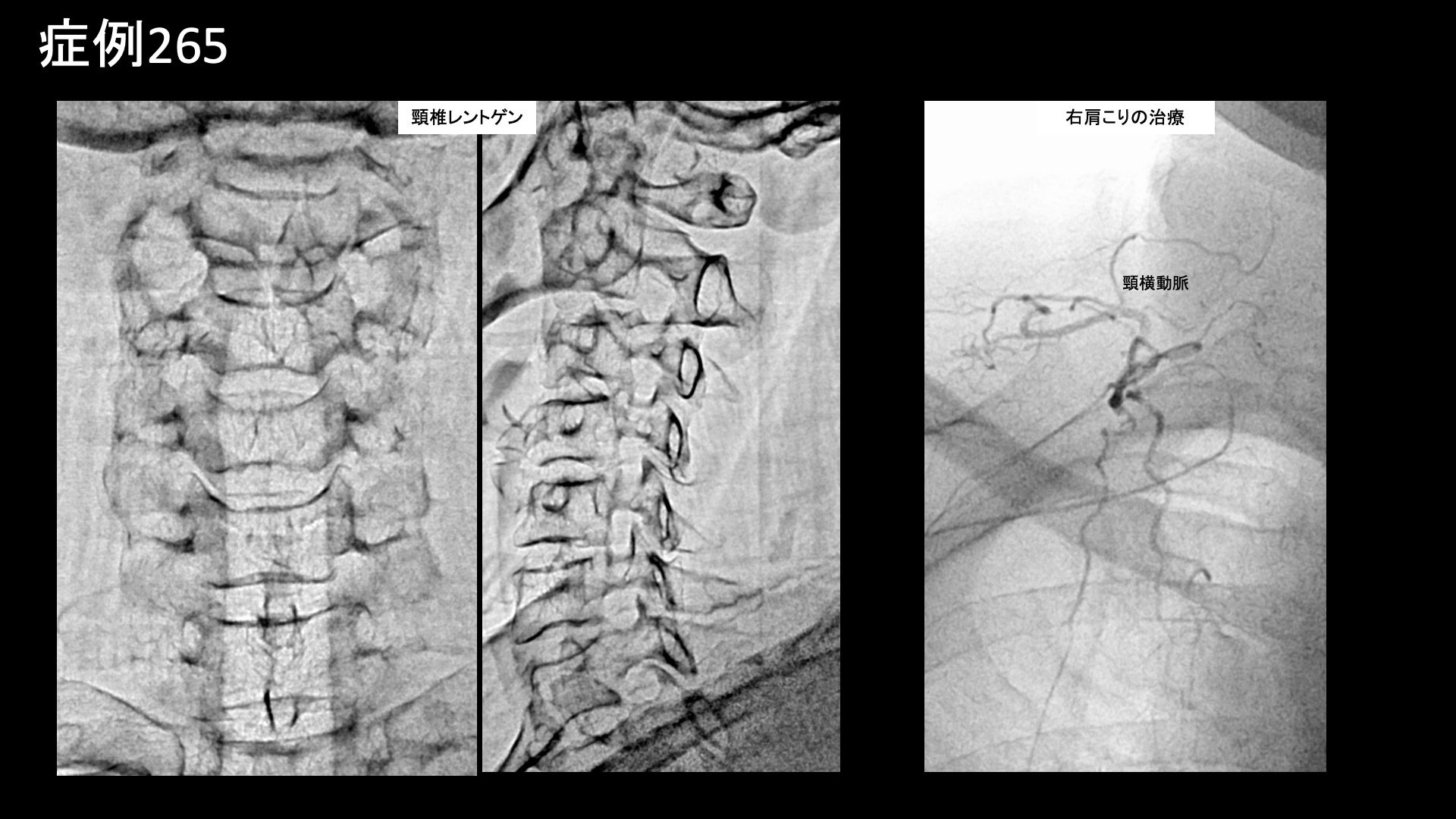 首の可動域を確認すると、側屈や回旋動作で中等度以上の制限がみられました。頸椎椎間関節や肩甲骨周囲に圧痛を認めました。触診では、こりの重症度は最重症レベルでした。エコー検査では、僧帽筋周囲組織の線維化が左側優位に進行していました。レントゲンでは、頸椎は保たれているものの、後頸部の項靭帯の石灰化を認めました。頸椎症は否定的であり、首肩こり(頸肩腕症候群)の診断でモヤモヤ血管の治療適応と判断し、モヤモヤ血管(病的新生血管)に対する運動器カテーテル治療(微細動脈塞栓術)を受けていただきました。
