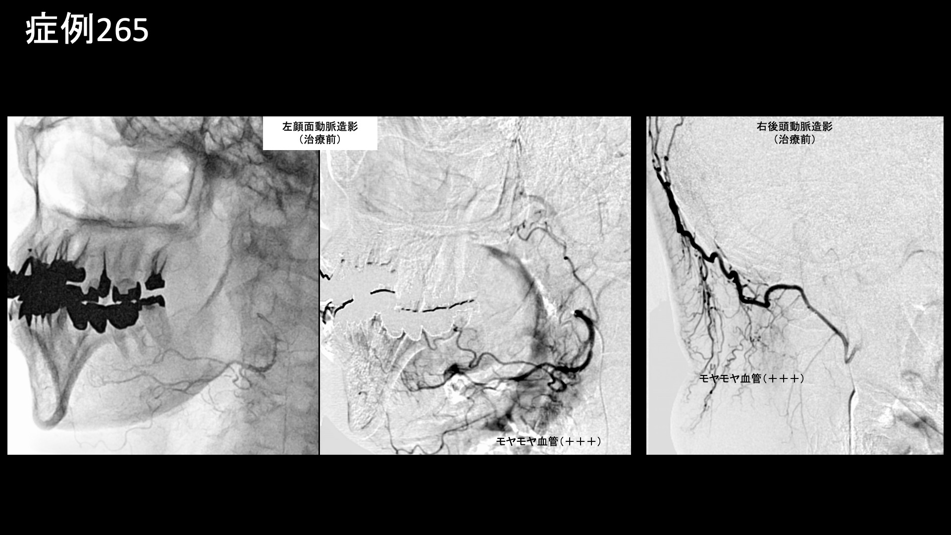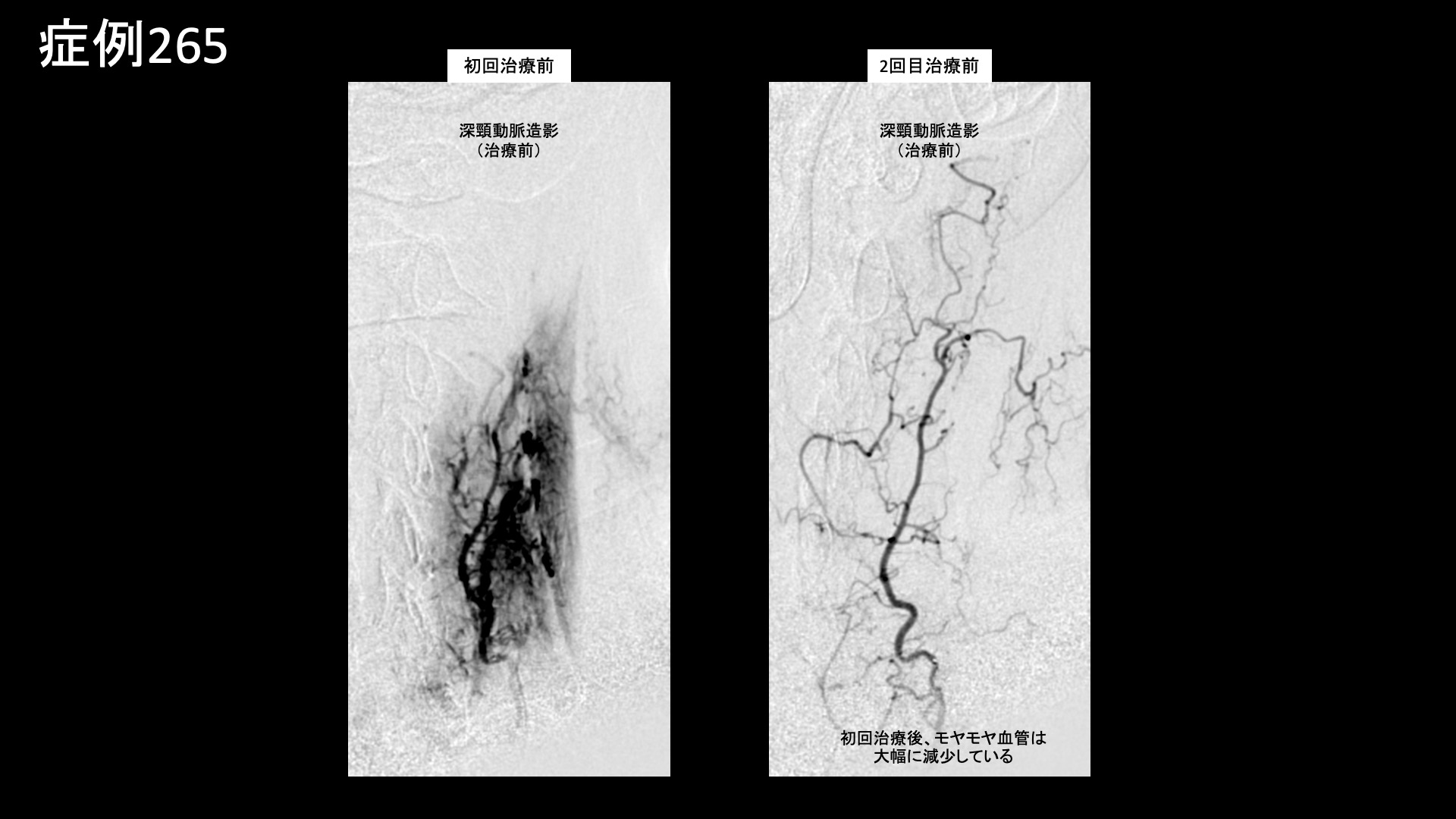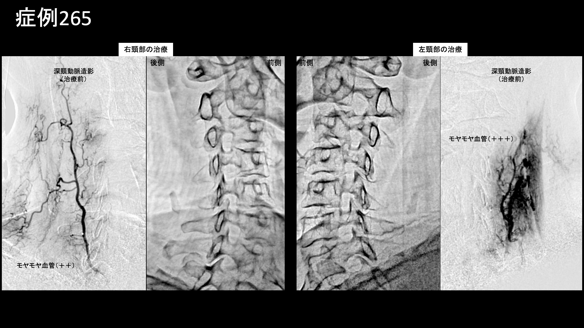 治療後1週間、まだはっきりとした変化は感じられないものの、肩甲骨の周りが動くようになった感じがしました。治療後2週間、肩甲骨がよく動くようになりました。頭痛はまだ変化がありませんでした。治療後1ヶ月、まだ首の重い感じが残っていました。治療後1ヶ月半、頭痛が軽減されてきたものの、首肩はまだドヨーンとしていました。効果は十分感じられたものの、一定の症状が残っていること、実は顎関節症(カクカクいっている)や食いしばり、頭重感もあるため、頭部顔面の治療も併せて追加治療を受けたいとご希望されたため、治療後3ヶ月で追加治療を行いました。まず、前回最も悪かった左頸部の血管造影を行いました。すると、モヤモヤ血管は大幅に減少し、血行が劇的に改善している様子が見て取れました。病的新生血管がモヤモヤ血管のような形で視認できるのは一部であり、この状態でも全く無いわけではありません。初回治療後も必ずある程度は残存していますし、新たに生じてくるものもあります。追加治療を行う意義は、初回時には到達しにくかった部位に薬液が到達できる利点も含めて、病的新生血管をさらに減少させるところにあります。前回同様部位を治療した後、続いて頭部・顔面の治療に入りました。左顔面動脈や右後頭動脈にてモヤモヤ血管が濃染像として描出されました。治療後は画像上速やかに消失しました。その他複数箇所の治療を行い終了しました。追加治療から1ヶ月後、常にあった頭重感が無くなりました。治療後2週間くらいから改善したようですが、すごく楽になったので、いつから楽になったかも覚えていないほどと言われました。しばらく他部位の治療のために通院を続けていましたが、首肩も同様に改善が進み、加療不要となりました。元々積極的に運動をされる方で、ご自身で再発予防に取り組まれていたこともあり、特にぶり返すことなく、治療後5ヶ月で終診となりました。