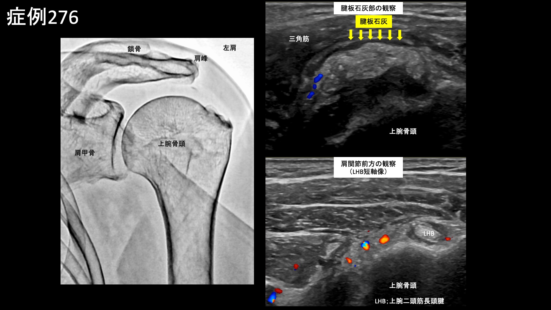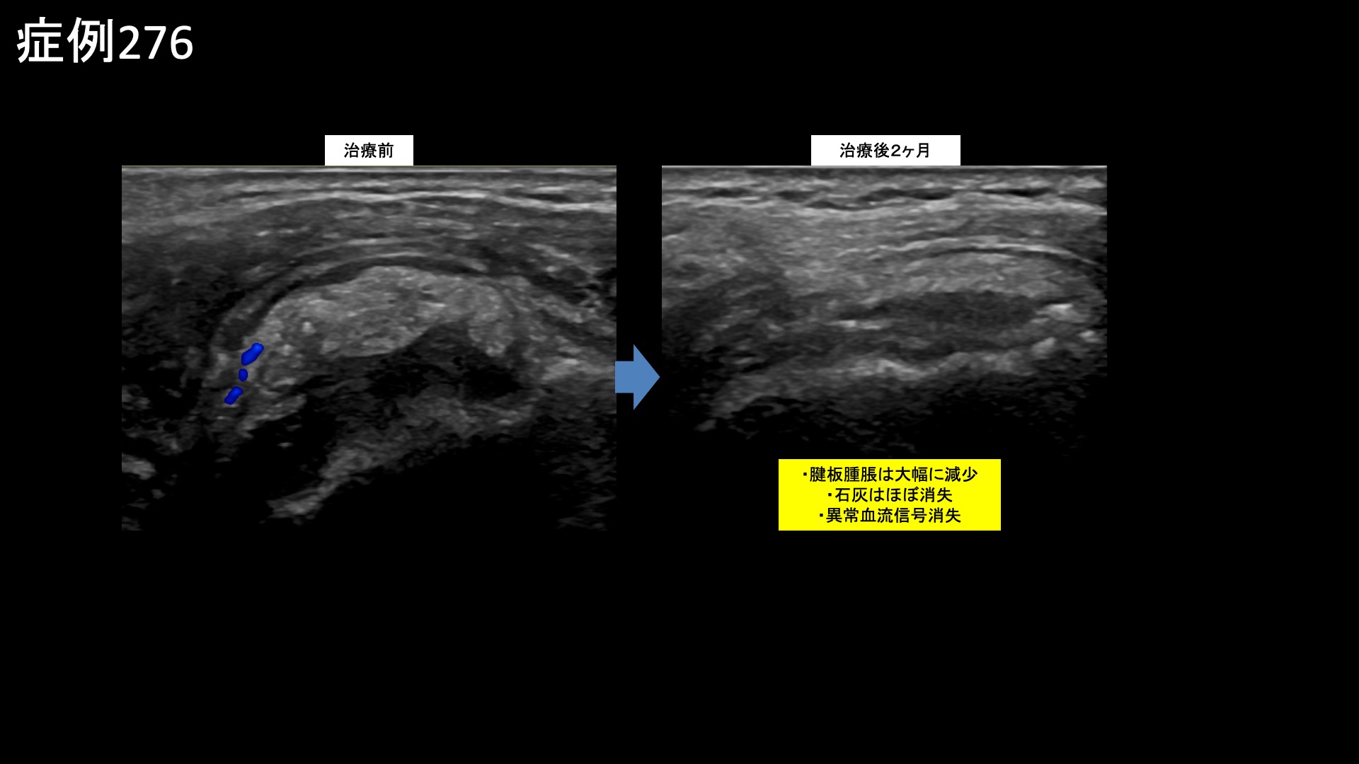 治療後2週間くらいから改善し、治療後3週間では痛みがだいぶ取れて、腕を水平までは上げられるようになりました。首のツッパリが無くなりました。さらに改善が進み、治療後1ヶ月半を過ぎてくると、ほとんど日常生活に支障が無くなりました。治療後2ヶ月、可動域は外転160度、外旋60度、反対の肩に手を回すなどの水平内旋動作も回復し、後方の結帯動作では第4腰椎レベルまで腕を後ろ手に回せるようになりました。回復の速さに周囲からも驚かれたそうです。エコー検査をすると、石灰はほぼ消失、腱板の腫脹も大幅に減少して周囲の(炎症を反映した)異常血流信号も消失していました。画像上も劇的に改善しました。非常に経過良好でしたので、特段の注射加療を行うこともなく治療後3ヶ月の再診としました。その再診時、痛みはほぼ消失していました。首の張りも無くなり、一緒に治療を受けて良かったと言われました。この時点で終診となりました。