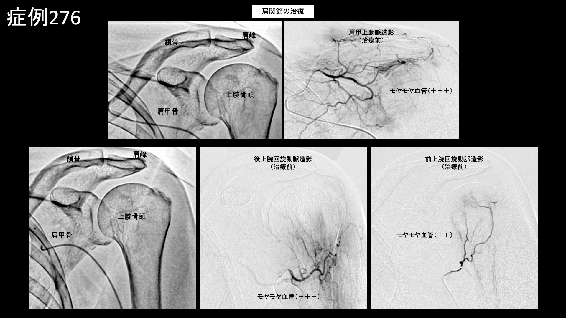 血管造影を行うと、肩甲上動脈、前上腕回旋動脈、後上腕回旋動脈などでモヤモヤ血管が濃染像として描出されました。治療後は画像上速やかに消失しました。その他複数箇所の治療を行い終了しました。