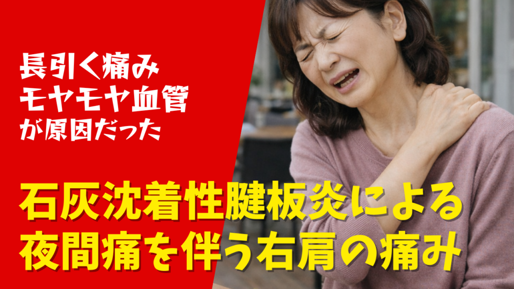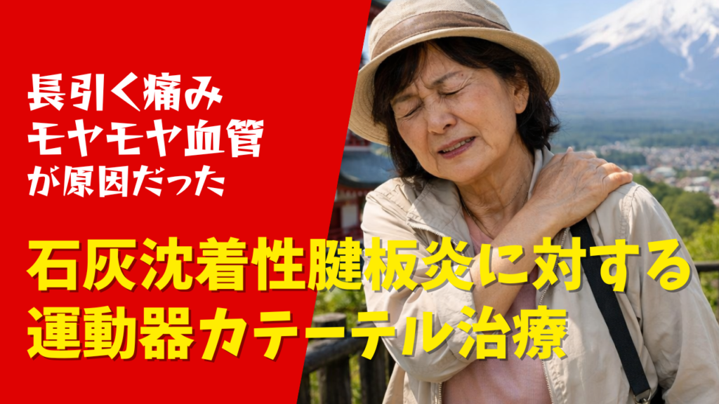 石灰沈着性腱板炎 石灰沈着性腱炎は、腱の周囲に石灰が蓄積し、痛みを引き起こす病気です。腱は筋肉の先端が硬くなった部分で、筋肉の動きを腕や脚に伝える役割を担っています。体のさまざまな部分に存在していますが、特に関節周囲や手足に多く見られます。この腱の周囲に、白いチョークのような石灰成分がたまることで、腫れや熱を伴い、強い痛みを引き起こすことがあります。石灰沈着性腱炎は炎症の一種と考えられていますが、なぜ石灰が蓄積する炎症が発生するのかは、まだ完全には解明されていません。特に肩関節にある「腱板」という部位に起こることが多く、その場合は「石灰沈着性腱板炎」と呼ばれます。 症状 肩の前方または後方に痛みを感じ、肩に力が入りづらくなることがあります。また、多くの場合、肩の可動域が制限され、特に腕を上げる際に痛みが生じます。さらに、痛みや違和感が腕全体に広がる(放散する)こともあります。痛みが強い時期には、睡眠を妨げることもあります。この症状は、突然発症することもあれば、徐々に痛みが増していくケースもあります。慢性化すると、筋肉の萎縮が進行することもあります。 原因 肩関節の主要な筋肉である腱板内にリン酸カルシウムが沈着し、時間の経過とともにそれが蓄積して膨らむことで、痛みが増していきます。さらに、腱板から滑液包内にカルシウムが破れ出ると、肩の動きに伴って激しい痛みが生じ、運動制限を引き起こします。しかし、このリン酸カルシウムがなぜ沈着するのか、その原因はまだ特定されていません。 治療 急性の場合、激しい痛みを早く和らげるために、腱板に針を刺して沈着した石灰を破り、ミルク状の石灰を吸引する方法がよく行われます。また、三角巾やアームスリングを使って安静を保ち、消炎鎮痛剤の内服や、水溶性副腎皮質ホルモンと局所麻酔剤を滑液包内に注射する治療が有効です。多くのケースでは、保存療法で症状が軽快しますが、亜急性型や慢性型では、石灰が石膏のように硬くなることがあり、強い痛みが再発することもあります。硬くなった石灰が肩の動きに伴って周囲と接触し、炎症が消えず痛みが続くこともあります。痛みが強く、肩の動作に大きな支障がある場合は、手術による摘出が検討されることもあります。痛みが軽減した後は、温熱療法(ホットパックや入浴)や運動療法(拘縮予防や筋力強化)を行うリハビリテーションが推奨されます。 モヤモヤ血管と運動器カテーテル治療 近年注目されている治療法として、運動器カテーテル治療があります。この方法は、痛みを長引かせている微細な病的新生血管、通称「モヤモヤ血管」に直接アプローチすることで症状を改善します。モヤモヤ血管が発生するとなぜ痛みが生じるのかについてご説明します。損傷を受ける、あるいは繰り返しのストレスにより炎症が起きている部位には、その修復の過程で血管が増えます。痛みの原因部位にできてしまう異常な血管が、血管造影画像では、かすんでぼやけて見えるため、この新生血管をわかりやすいように“モヤモヤ血管”と呼んでいます。モヤモヤ血管は通常、出来ては消え、出来ては消え、ということを繰り返していますが、何らかの原因で消えなくなった病的新生血管のそばには病的な神経も増殖していることが分かっています。これらが痛み信号を発するほか、病的血流が増えることで局所の組織圧が高まることなどにより、五十肩や腰痛、膝の痛みなどの長引く痛みが引き起こされると考えられています。一般に、40歳以上になるとモヤモヤ血管を自然に減らす力が衰えてくるため、長引く痛みが生じやすくなります。微細な血管は通常の治療ではアクセスが難しい部位に存在します。運動器カテーテル治療では、これらの血管にカテーテルを用いて薬剤を直接注入し、炎症を抑えます。通常の治療で良くならない場合、あるいはとにかく早く楽になりたい方は、この治療法を検討されるとよいでしょう。 治療前画像:損傷を受ける、あるいは繰り返しのストレスにより発生した異常な新生血管 治療後画像:カテーテルを用いて塞栓物質を血管内に投与し新生血管を塞いだ状態 治療費用:税込324,500円 主なリスク・副作用等:針を刺した場所が出血により腫れや痛みを生じたり、感染したりすることがあります(穿刺部合併症)。造影剤によるアレルギー(皮膚のかゆみ・赤み・息苦しくなるなどの症状)が出ることがあります。 運動器カテーテル治療のメリット 有効性:薬剤を内側から直接患部に届けるため、高い有効性が期待できます。 即効性:夜間痛・強い安静時痛については早期から改善します。 安全性:ステロイドのような副作用がなく、長期的な使用が可能です。血管から作用させるのみであり、組織を傷つける心配がありません。 低侵襲:負担の少ない治療であり、当日から治療後の特別な制限は不要です(日帰り手術)。小児~高齢者まで幅広く気軽に受けていただけます。 効